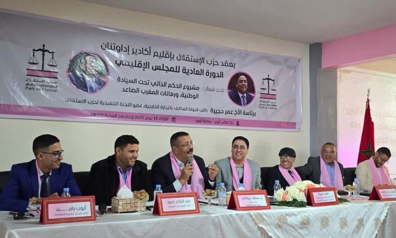عقد حزب الاستقلال اليوم الثلاثاء 18 نونبر الجاري، بجماعة أورير شمال أكادير، دورة مجلسه الاقليمي لعمالة اكادير إداوتنان، تخليدا للذكرى الخمسين للمسيرة الخضراء المظفرة واحتفالا بالذكرى السبعين لعيد الاستقلال المجيد، برئاسة الدكتور توفيق حجيرة مبعوث اللجنة التنفيذية للحزب وكاتب الدولة المكلف بالتجارة الخارجية، وبحضور النائب البرلماني الدكتور جمال ديواني عضو المجلش الوطني للحزب، تحت شعار “مشروع الحكم الذاتي تحت السيادة الوطنية ورهانات المغرب الصاعد”.