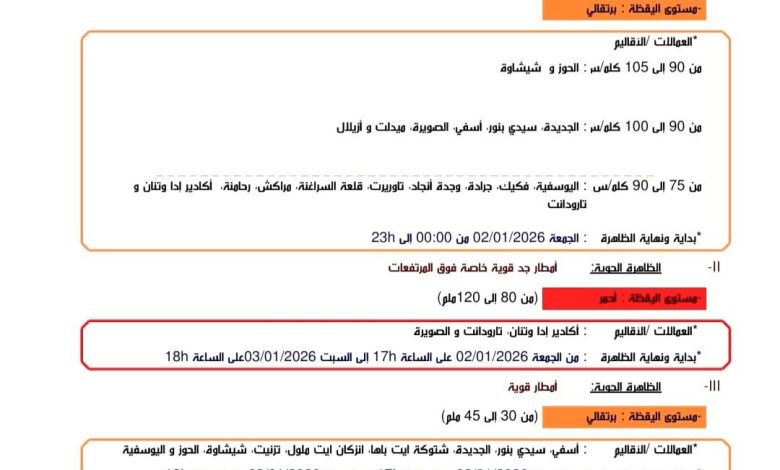 نشرت مديرية الارصاد الجوية صبيحة اليوم الخميس فاتح يناير الجاري، نشرة انذارية بهطول أمطار جد قوية من المستوى الأحمر بمجموعة من المناطق وخاصة ببعض المناطقة بجهة سوس ماسة تصل فيها التساقطات المطرية ما بين 80 و120 ملم وخاصة بعمالة اكادير إداوتنان وإقليم تارودانت، وذلك ابتداء من مساء يوم الجمعة 2 يناير إلى غاية يوم السبت 3 يناير الجاري، مع هبوب رياح جد قوية تتراوح سرعتها بين 75 و90 كلم/س من الساعة الثانية عشرة ليلا منتصف ليلة الجمعة الى غاية الحادية عشرة ليلا من مساء يوم الجمعة.
